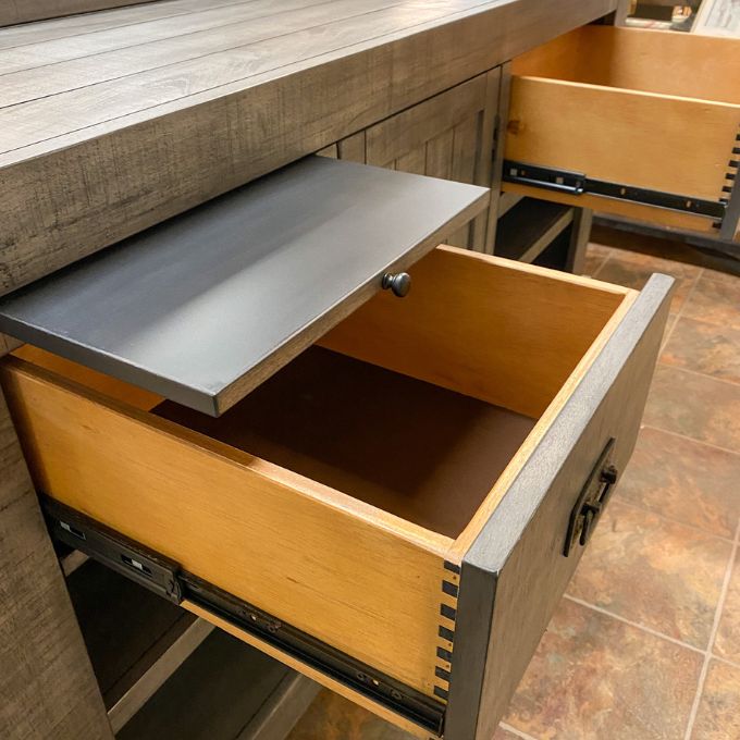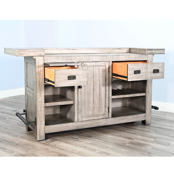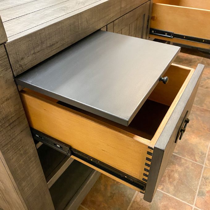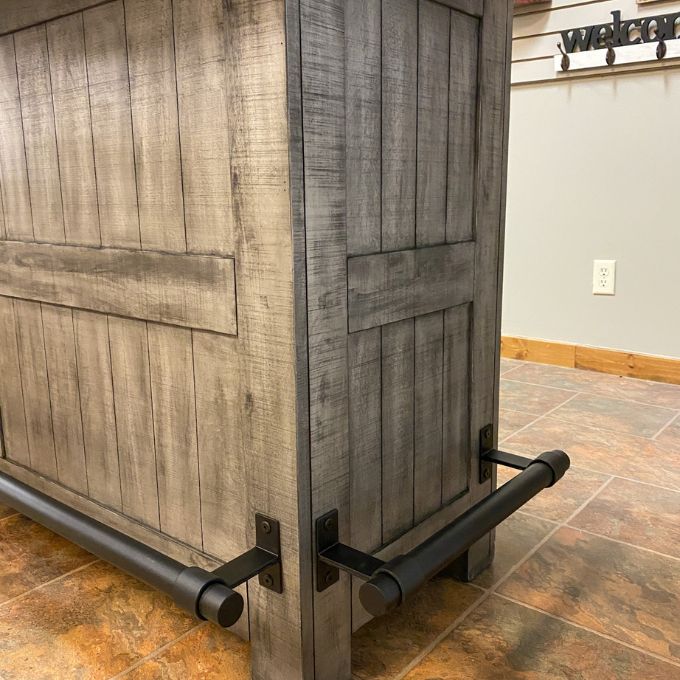 You'll enjoy lots of storage! The Homestead Hills Bar has a large countertop with three drawers, one door, all with metal hardware, and built-in pull-out tray. The metal foot rest around the outside makes it feel like a real bar and will keep your guests "bellied up to the bar" the whole night!