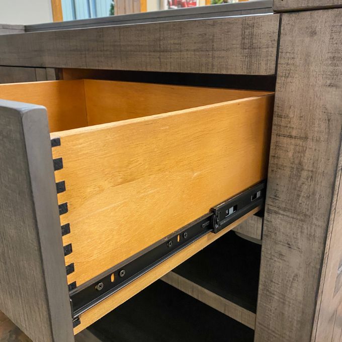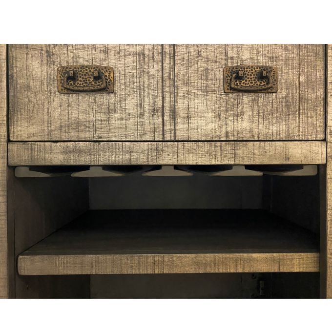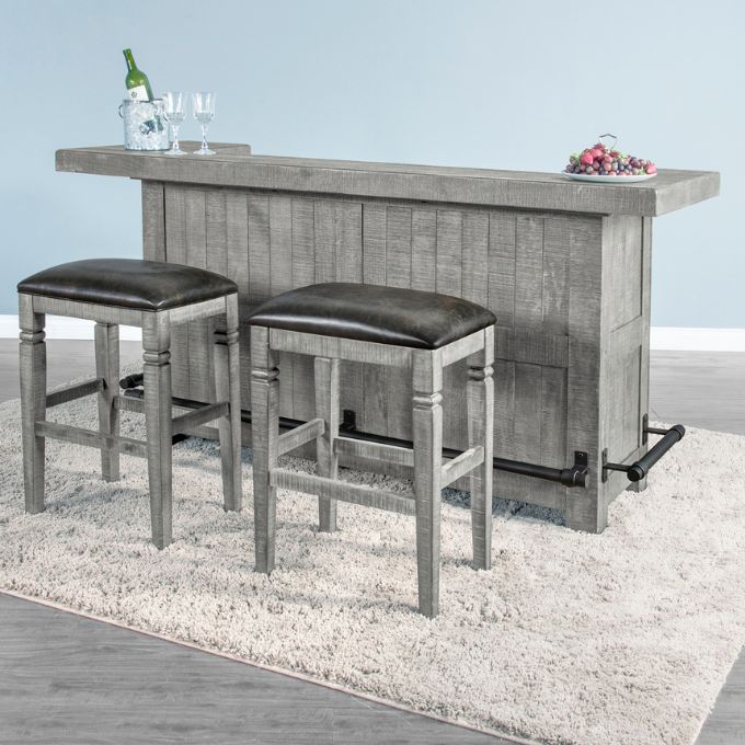 Crafted with mahogany solids and veneers the Homestead Hills Bar is well-made. The rough sawn distressing is complemented with a gorgeous alpine grey finish and straight marlborough legs.