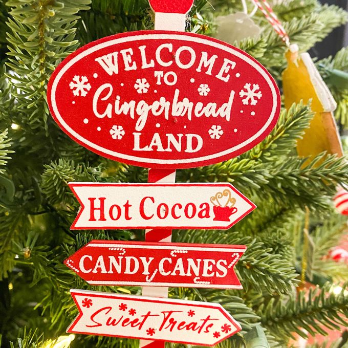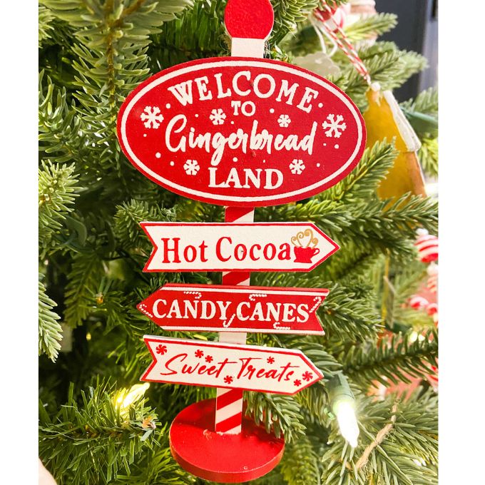 Welcome to Gingerbread Land! A cute little ornament to point the way to all the treats! Hot Cocoa, Candy canes, sweet treats are all important during the holidays - add this cute Gingerbread Sign to your tree. It is 6" tall.