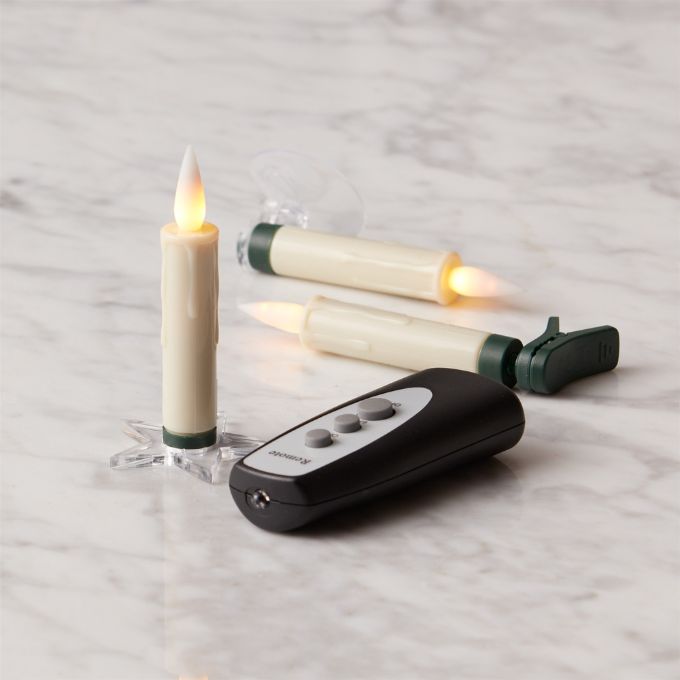 Add instant light to any display! These are Flameless Candles that can be used three ways to add a warm glow to your holiday decorating. Each of the ten candles comes with a clip so you can easily attach it to your tree, a garland or a wreath. Also included are five suction cups and five clear star shaped stands giving you some added versatility with the candles. And the best part - they operate with a remote!