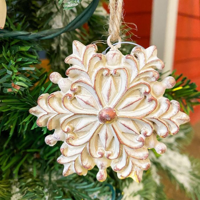 The Washed Gold Snowlake Ornament - Three Styles measures approximately 3" diameter.