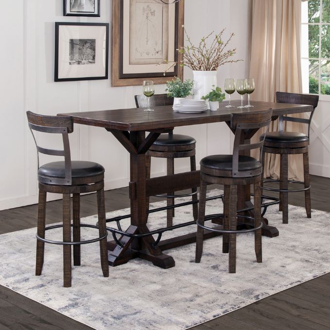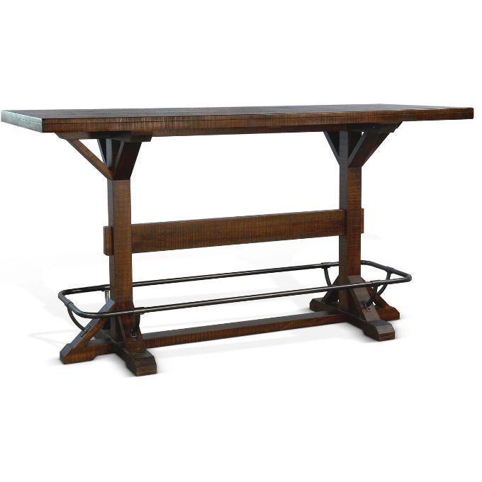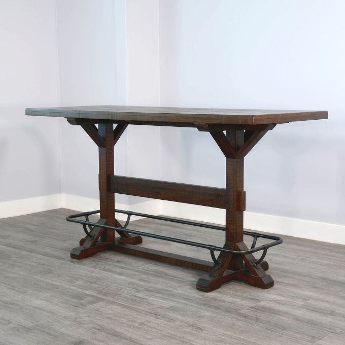 A modern rustic look is yours with the Homestead Pub Table. The design suggests contemporary with industrial trades and its metal foot rail gives it a very unique look and practicality that you're going to love. The tobacco leaf finish is a long-standing favourite from this supplier and contributes to the rustic feel of the planked top. This bar height table will serve you well as a unique kitchen or dining table as well.