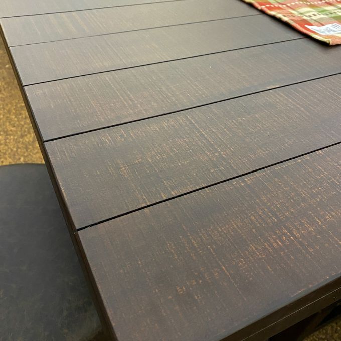 The Homestead Pub Table was constructed with mahogany and mindi solids and veneers. It measures 78" x 32" x 42".