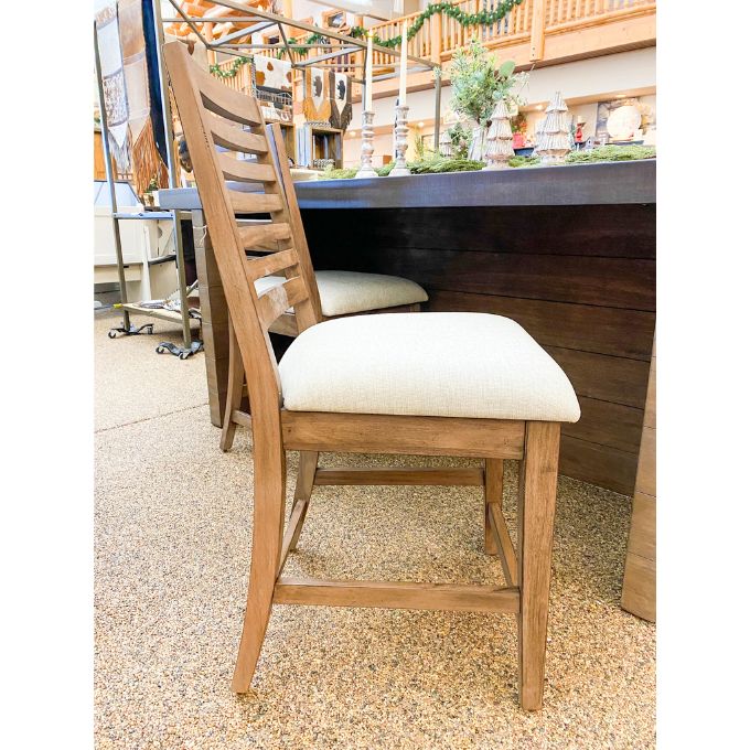 If you are looking for a comfortable seating option in a stool, look no further. Constructed of mahogany solids and wood veneers the Doe Valley Ladderback Counter Height Stool is sure to be a sturdy option. The buckskin finish is a light brown finish and is a soft, pretty colour. The upholstered seat is a cream stain-resistant fabric for easy care, and of course comfort.
