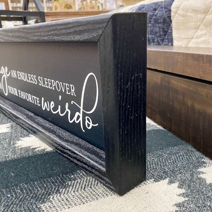 Ahh marriage - this sign about sums it up doesn't it! Have a laugh with your spouse over this one! The sign says in white on a black background: Marriage an endless sleeepover with your favorite weirdo. It's great idea for a wedding or anniversary present.