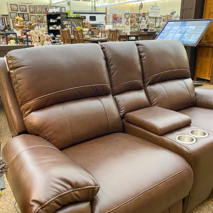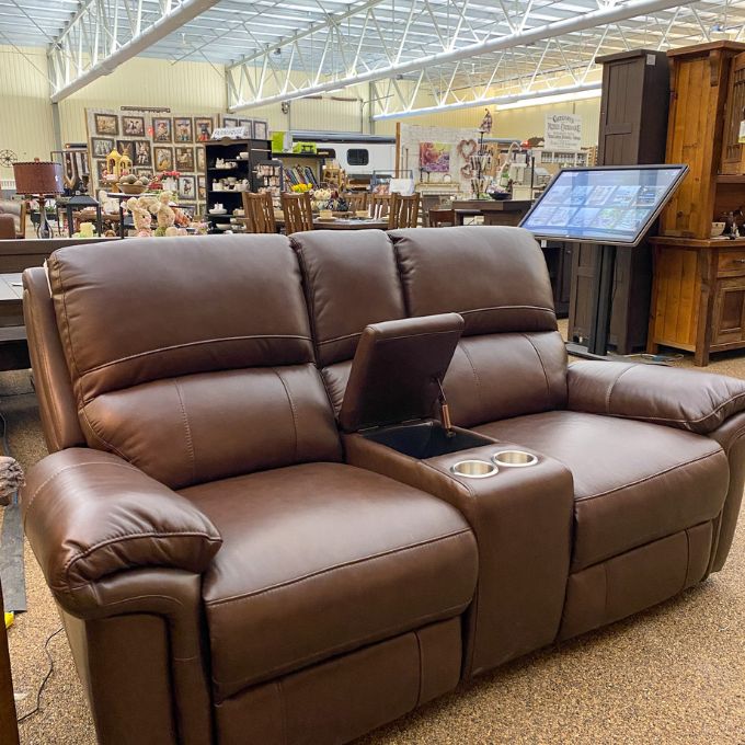 The Monica Reclining Love Seat is a made-in-Canada solution to your living room seating. Also part of the collection is a Sofa and Recliner. It is shown in Chestnut leather but also available in other options. Stop by the showroom and have a look.