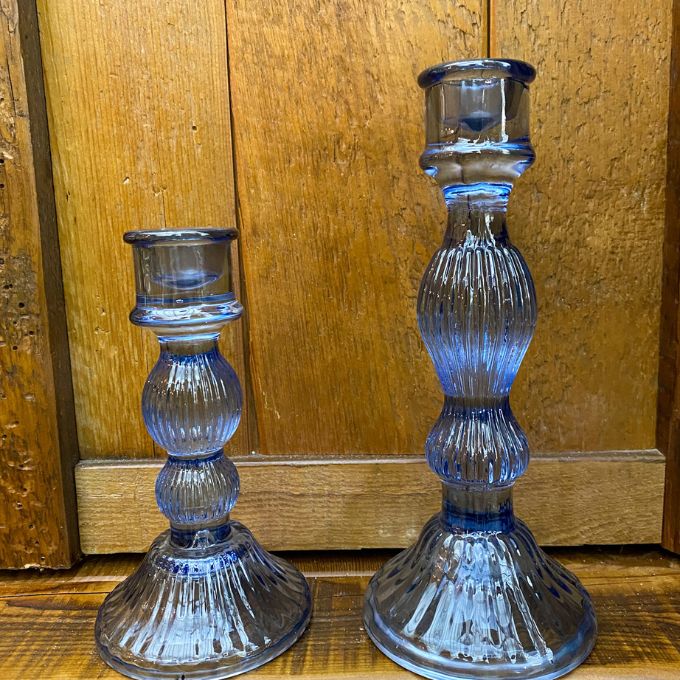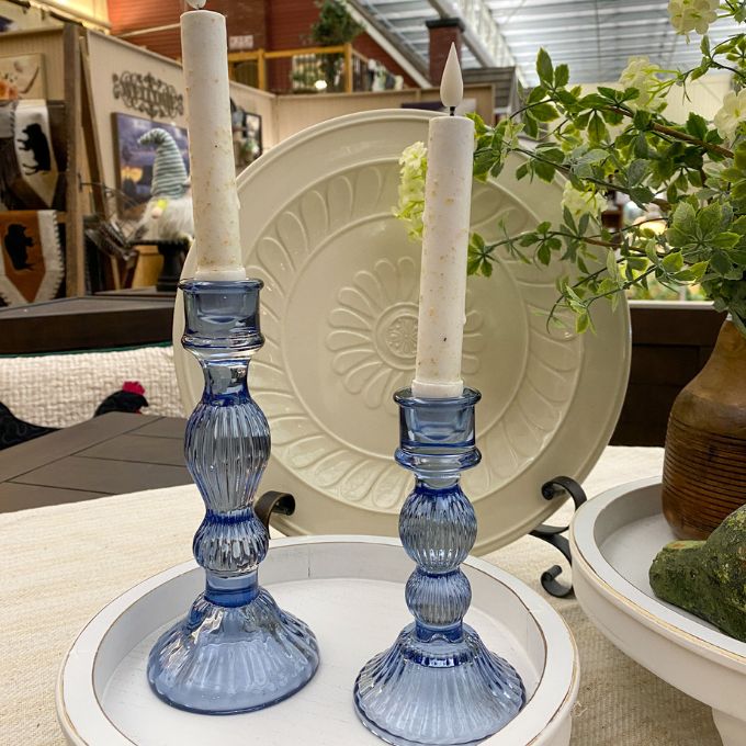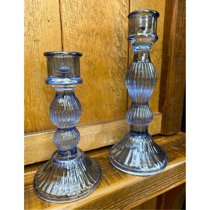 Ribbed navy glass and fluted bases evoke vintage charm, refracting candlelight for a quietly dramatic glow. The set of two staggered heights fits standard taper candles to style a collected look across mantels, consoles, or the dining table.