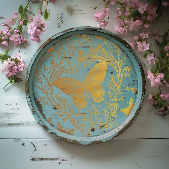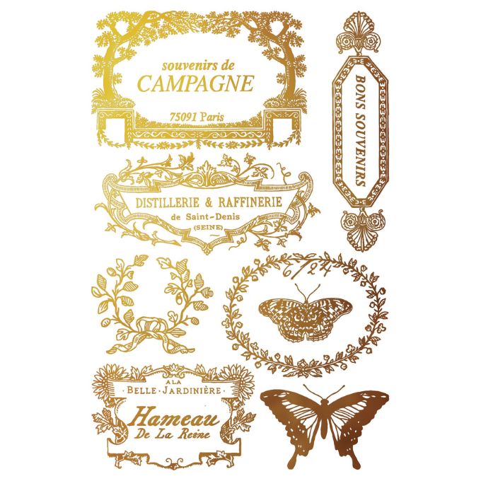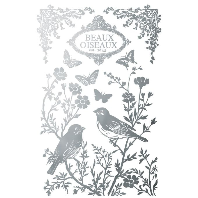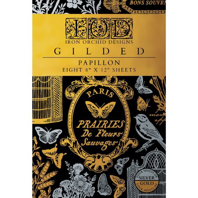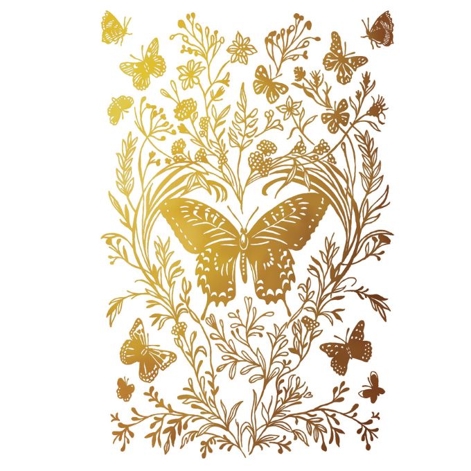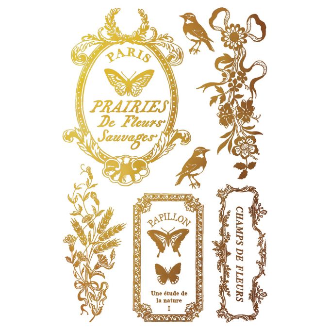 Papillon layers beautifully across a range of surfaces and can be used to create striking focal points or subtle gilded accents. The birdcages pair especially well with floral collections like Madeleine, allowing for elegant, mixed-style compositions. Whether applied to books, trays, décor pieces, or mixed-media artwork, this transfer adds a refined metallic touch that complements both vintage and modern projects.