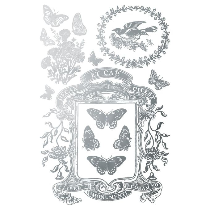 Introducing the Papillon Gilded Transfer Pad by IOD, a sophisticated celebration of vintage artworks finished in a lustrous blend of gold and silver. This collection draws from 19th-century publishing ephemera, including bookplate logos, ornate motifs, labels, typography, and a charming series of birdcage illustrations. The mix of imagery blends both refined detail and playful character, all elevated by the metallic finish.