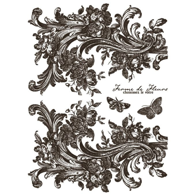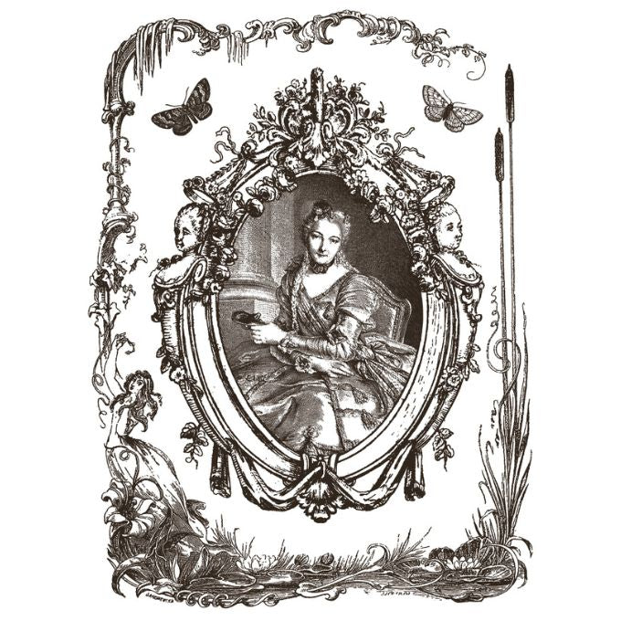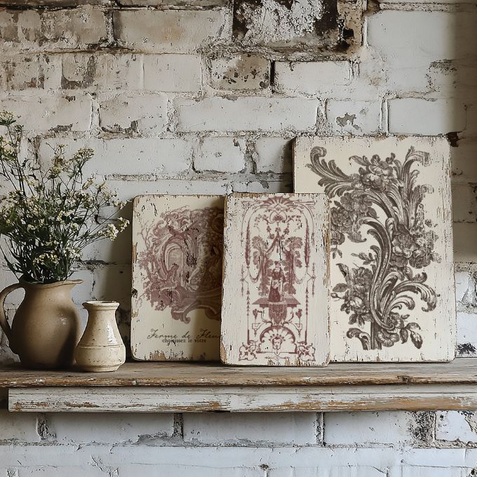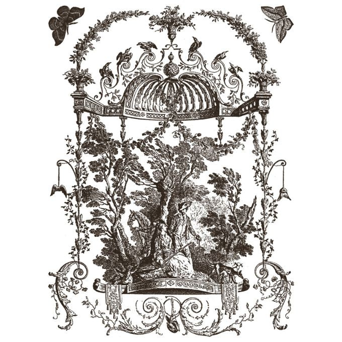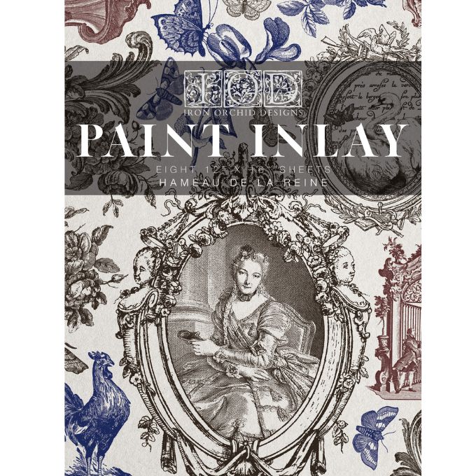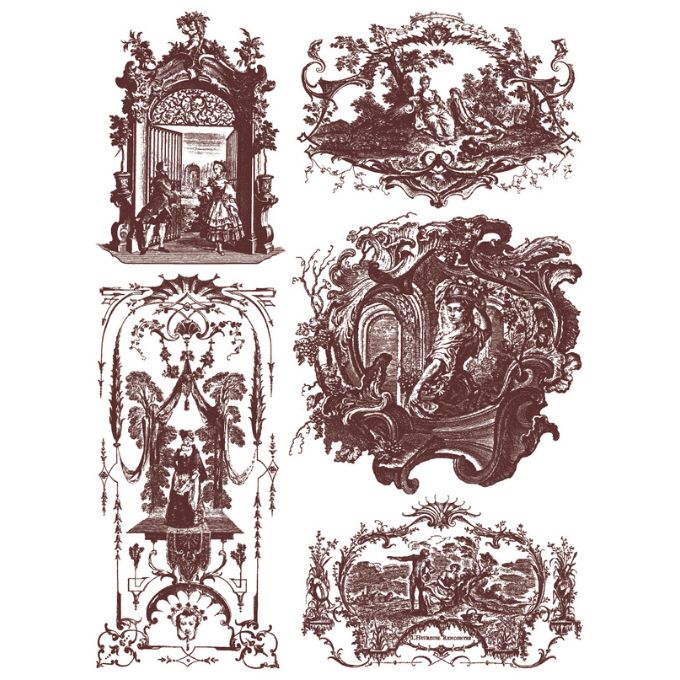 Soft distressing is intentionally built into the artwork, giving the designs a naturally aged feel from the very first use. A classic French palette of off-black, rich cobalt blue, and a deep plum-brown brings warmth and character, revealing subtle variation with each application. Thoughtfully scaled with a mix of full panels and coordinating elements, the imagery is designed to be used together on a single piece with ease.Romantic, storied, and unmistakably French, Hameau de la Reine invites you to create work that feels collected, timeworn, and beautifully lived in.