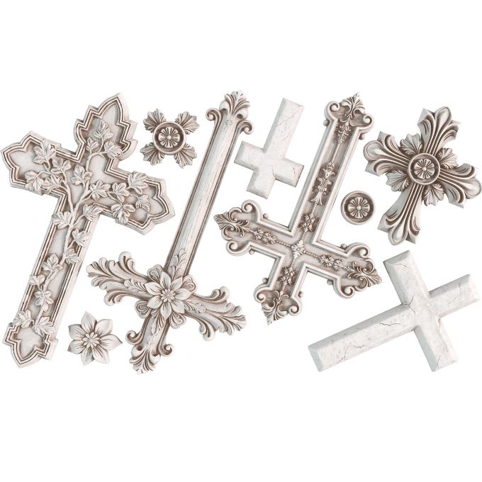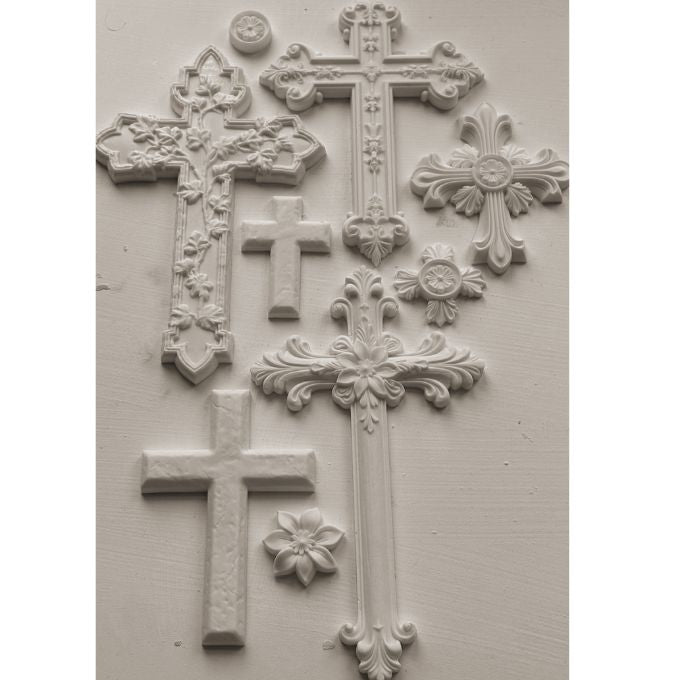 We've wanted a cross mould for quite some time. The 6" x 10" Les Croix Mould is our answer, gathering these ornamental designs into one beautifully detailed mould. The collection includes a mix of architectural ornament-style crosses, a botanical cross with raised leaves, and simpler forms that give makers a range of silhouettes to work with. Smaller coordinating pieces like medallions and flourished accents make it easy to build layered compositions or add subtle touches to a project.