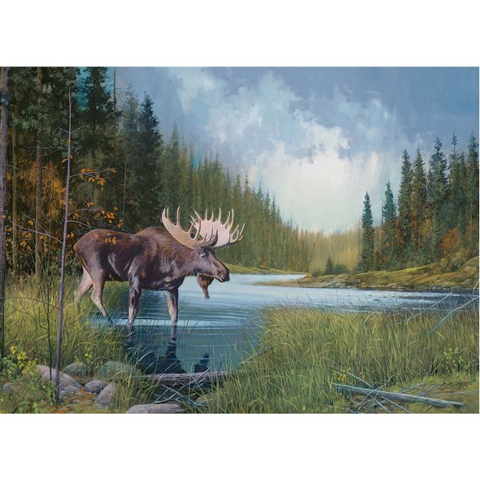 It's a serene morning at Moose Lake. The calmness is gently broken by the crossing of the horned beast across the waters. A peaceful 1000 piece wildlife puzzle by artist Douglas Laird. The finished size is 26.625" x 19.25".