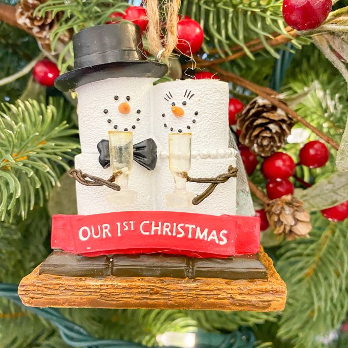 A cute way to celebrate a new bride and groom this holiday. This S'more First Christmas Ornament is a newly married couple toasting with champagne! The bride even has a pretty veil.